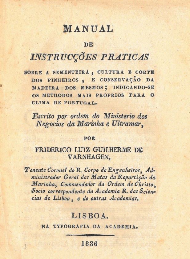 VARNHAGEN, Frederico Luiz Guilherme de – Manual de instrucções praticas sobre a sementeira, cultura e corte dos pinheiros, e conservação da madeira dos mesmos: indicando-se os methodos mais próprios para o clima de Portugal. Lisboa : Typografia da Academia, 1836. 101 p. Cota: NVP-32