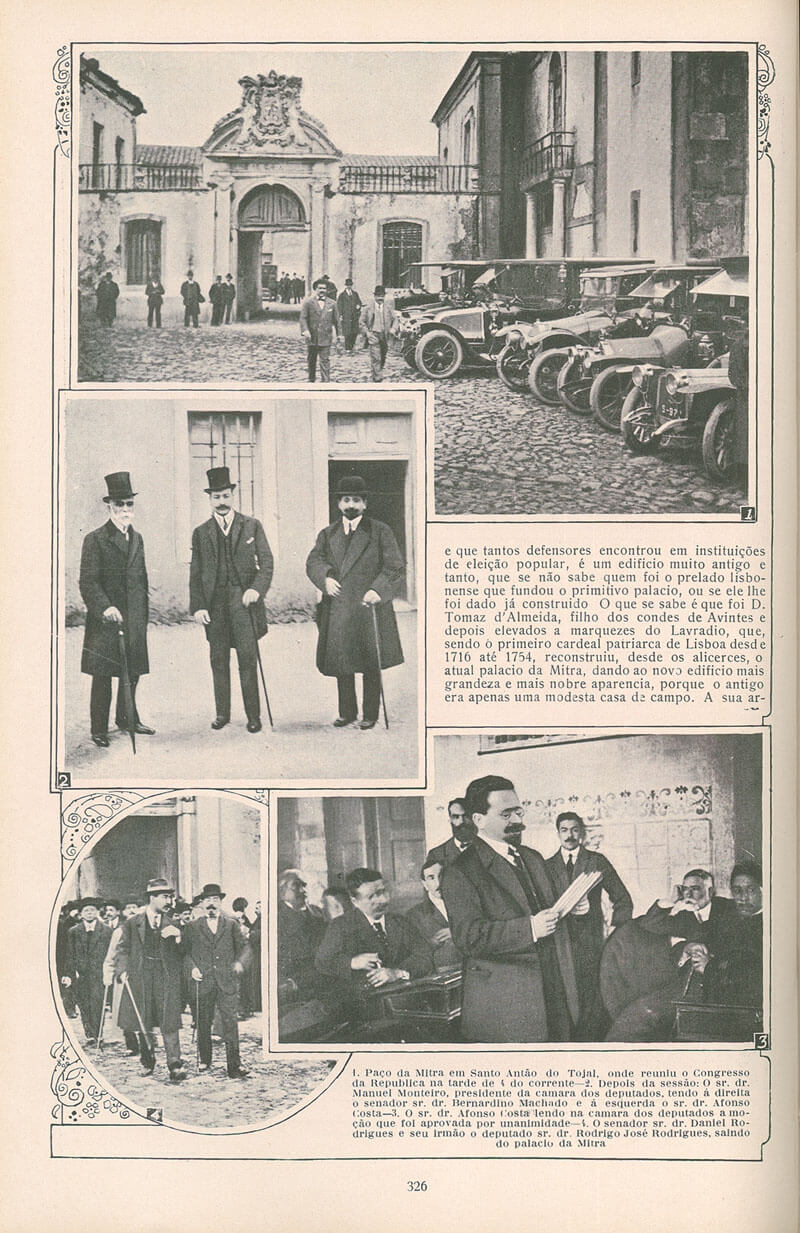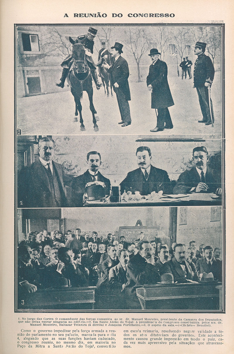 De acordo com A Capital, “o Palácio das Cortes conserva todas as portas e janelas fechadas, vendo-se apenas numa das janelas da extrema esquerda o Sr. Feio Terrenas, diretor do Congresso, com a sua cabeleira ao vento, analisando atentamente o largo. Uma multidão que circunda o Palácio vai gritando “Viva a República! Viva a Constituição!”, sendo afastada pela guarda republicana.